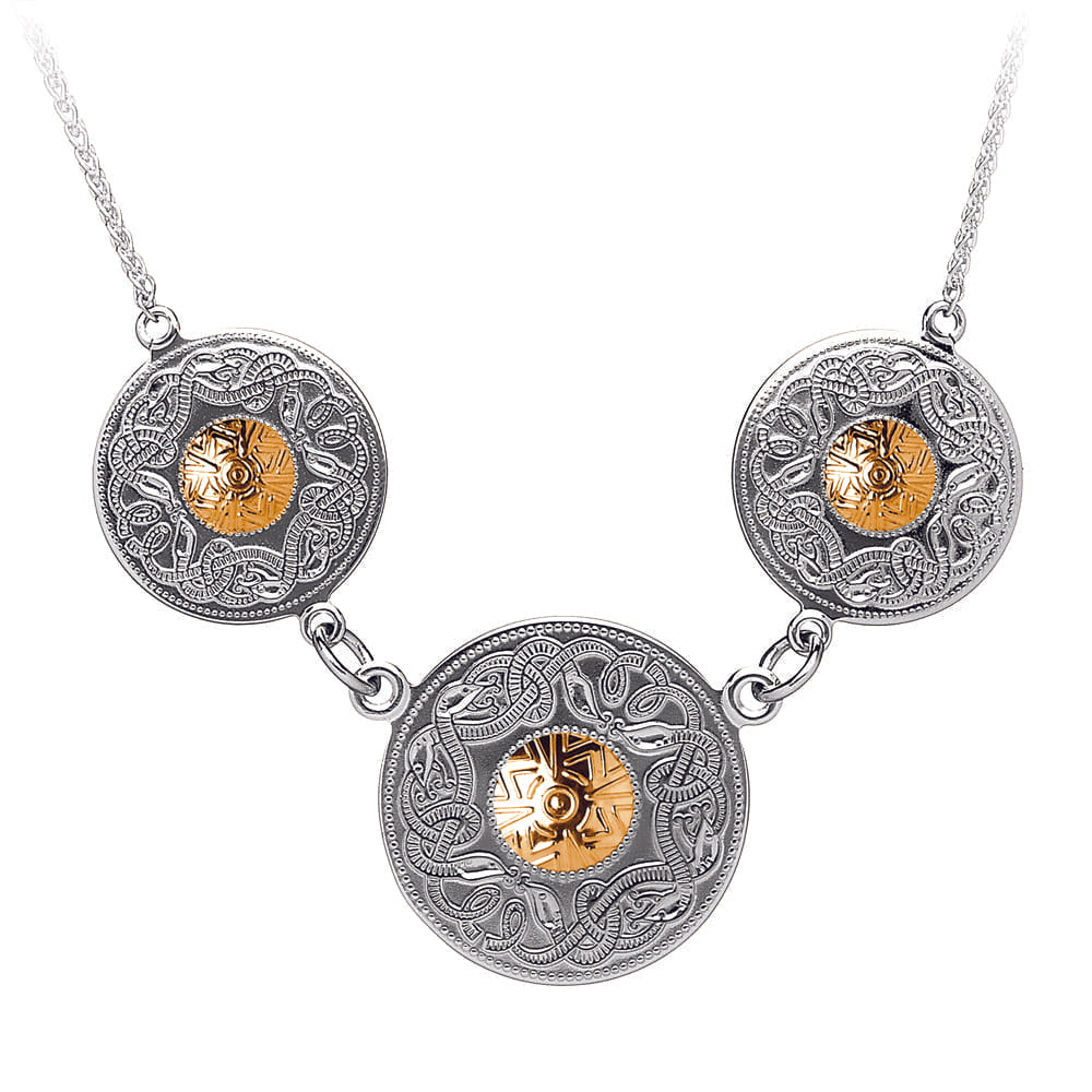 This Triple Celtic Warrior Necklace has three Celtic discs with an 18ct Gold Bead in the center.
